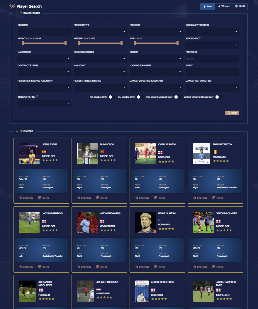 By using the available 25+ data entries per profile you can create a bespoke search in a matter of seconds meeting your desired parameters. For players, staff, and volunteers, your FREE profile ensures you are always visible, you appear in multiple repeated searches, to get your profile onto shortlists, which make it onto decision makers desks daily.