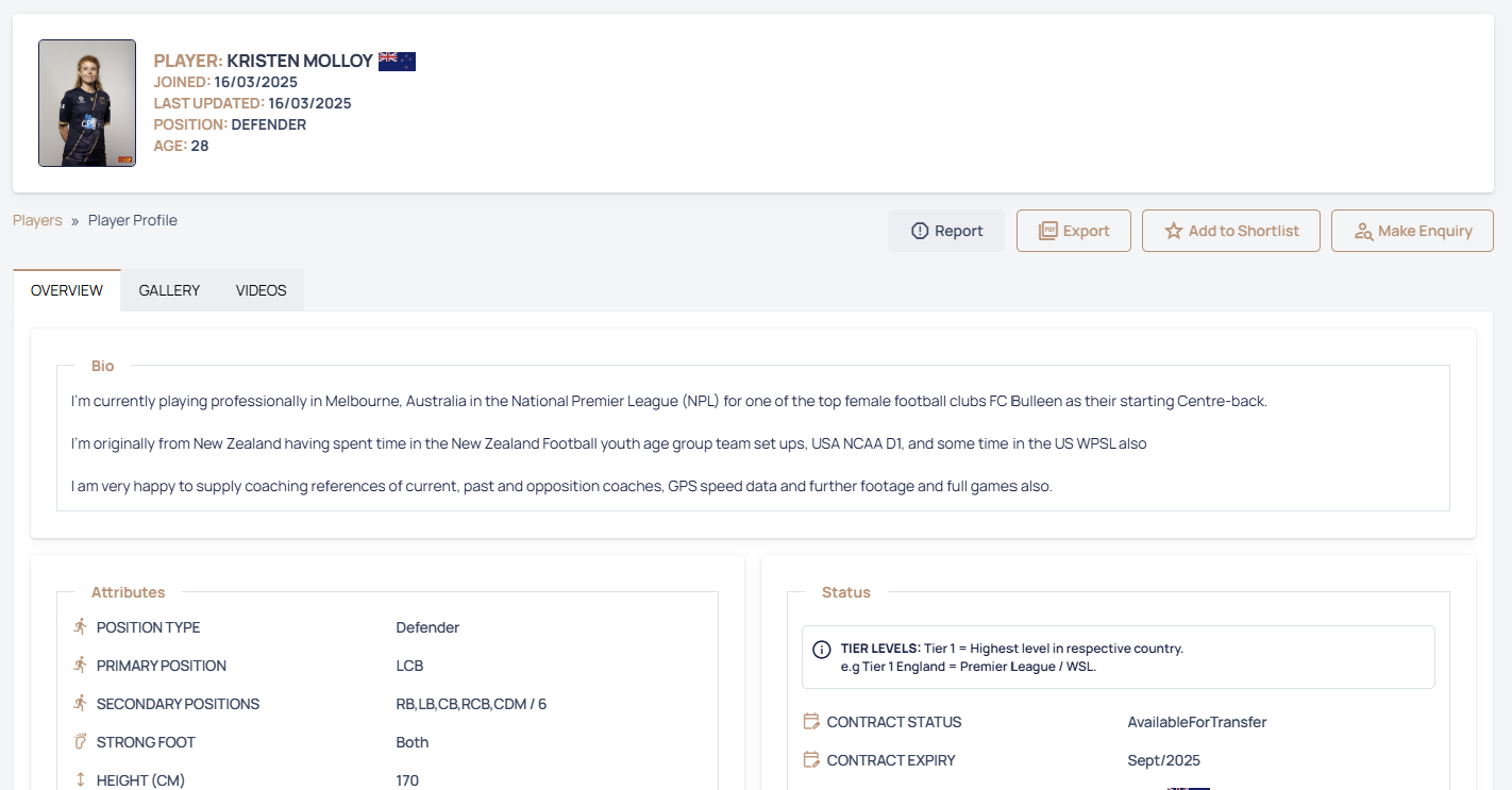 I'm currently playing professionally in Melbourne, Australia in the National Premier League (NPL) for one of the top female football clubs FC Bulleen as their starting Centre-back.
